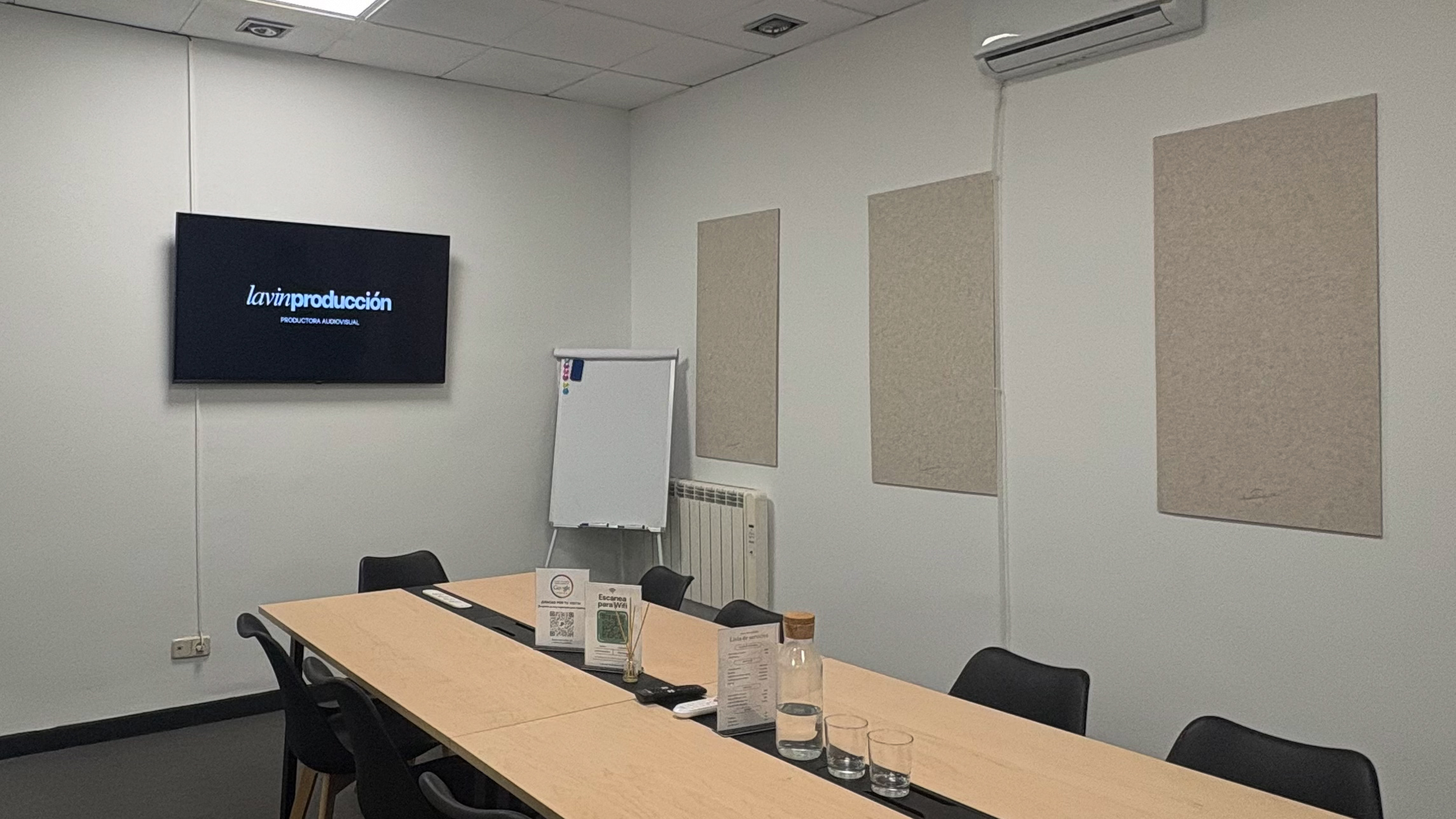 Sala de reuniones. Se puede alquilar junto a cualquiera de las dos salas para recibir invitados, ofrecer catering o habilitar maquillaje y peluquería. Dispone de televisión, climatización, Wi-Fi y un entorno cómodo para reuniones, briefing y coordinación de equipos.